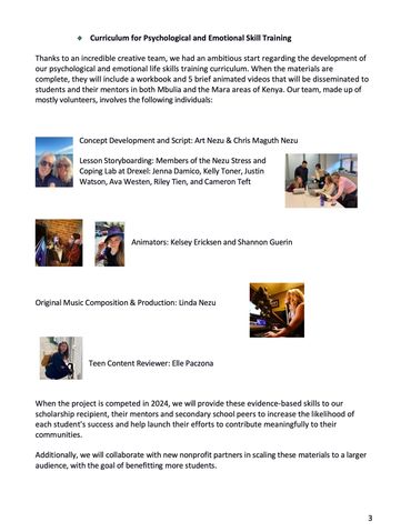 A meaningful way to improve a student's performance while providing her with educational opportunities is to help build her psychological and emotional life skills. As clinical psychologists and professors of psychology and medicine, our co-founders are passionately dedicated to a model of resilience. For this reason, we are focused this year on developing user-friendly, practically applied, culturally appropriate training materials for our scholarship recipients that can be taught by laypeople and peers.